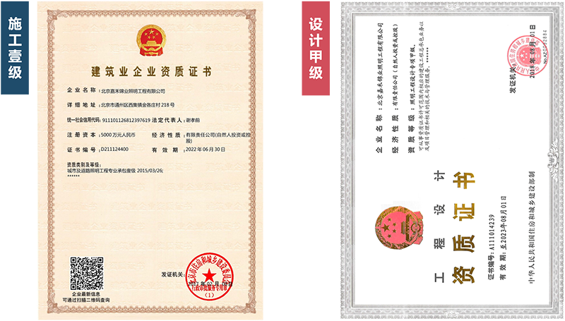 北京嘉禾錦業照明工程有限公司成立于2008年,公司注冊資本5000萬,是一家具有建設部頒發的"城市及道路照明工程專業承包資質施工壹級"、"照明工程專項設計資質甲級"。