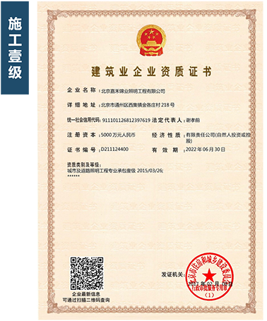 北京嘉禾錦業照明工程有限公司成立于2008年,公司注冊資本5000萬,是一家具有建設部頒發的"城市及道路照明工程專業承包資質施工壹級"、"照明工程專項設計資質甲級"。